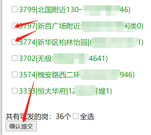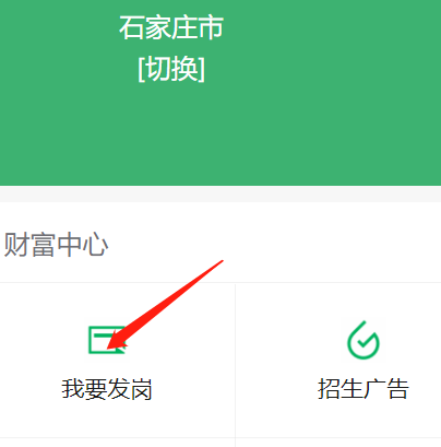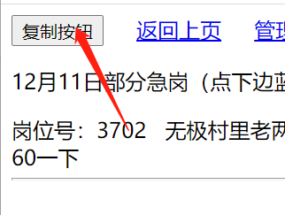 个人后台第一项就是我要发岗,点开后,选择自己喜欢的岗位,然后,点击选择列表下边的确认提交按钮,然后,点击左上角的复制按扭,复制成功,就可以到各个群里发岗去了,注意:点击复制按钮时候,不是按住不放,而是点击一下即可。如下图: